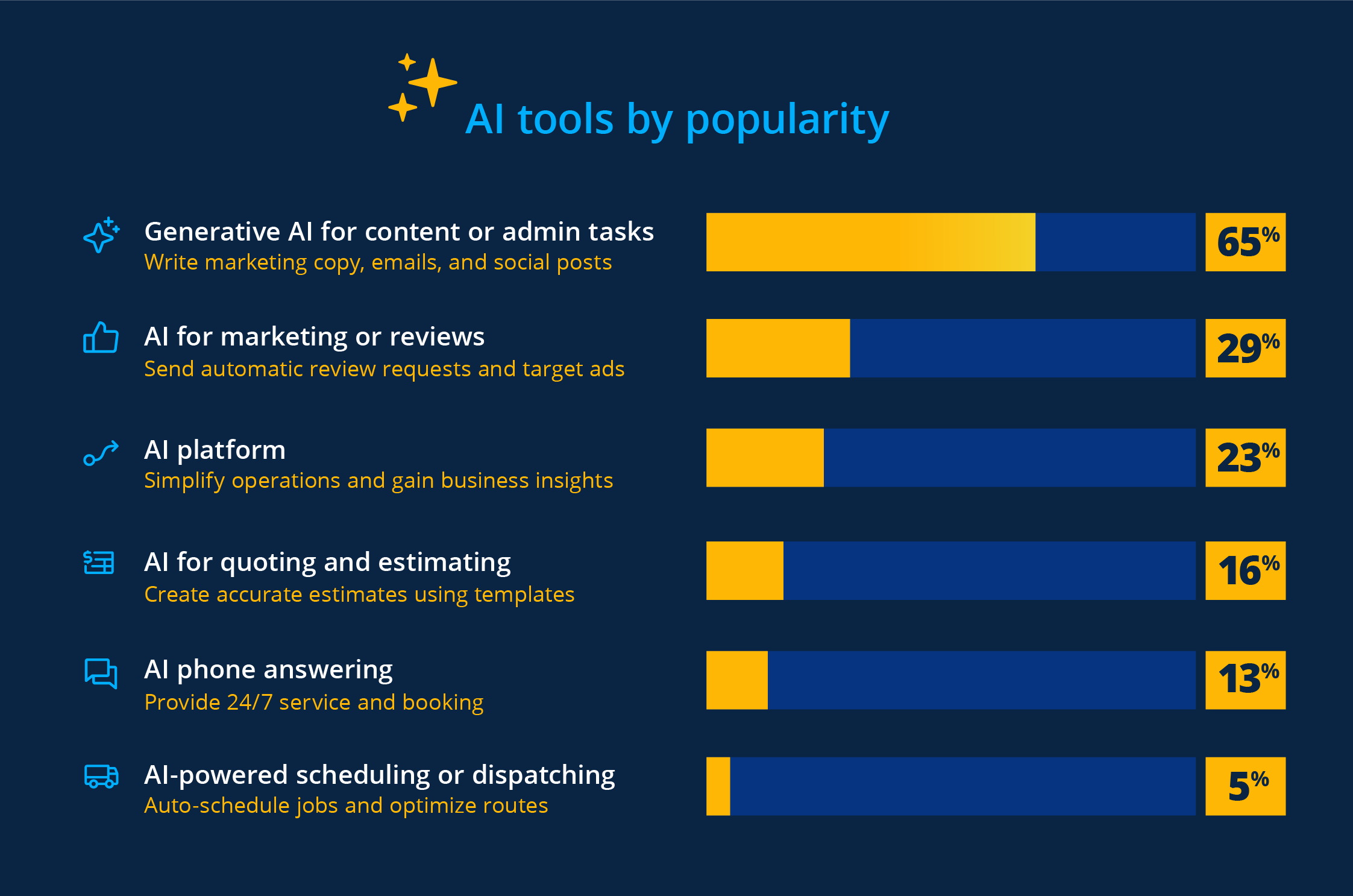 In our fall 2024 Trends Report, 41% of trade business owners (Pros) surveyed had explored AI, and only 1 in 4 reported seeing real gains. Just six months later, over 70% of Pros have tried AI—and 57% have seen growth in their business. AI is no longer just for big tech companies. Electricians, plumbers, HVAC techs, and skilled workers are actively integrating it into their day-to-day operations.