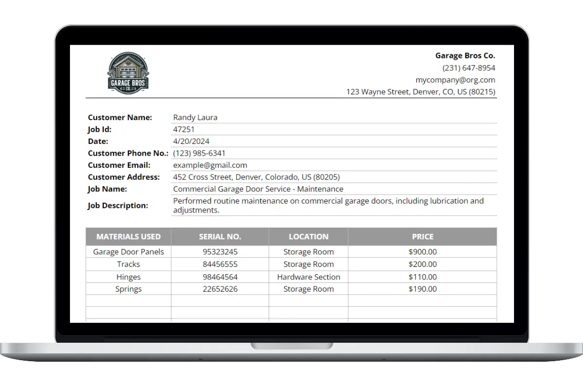 This garage door service report is a quick and easy way to streamline service documentation, ensure accurate record-keeping and improve customer satisfaction.