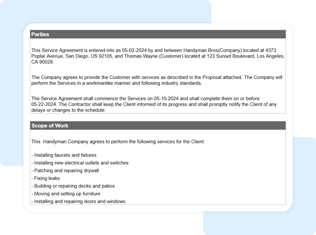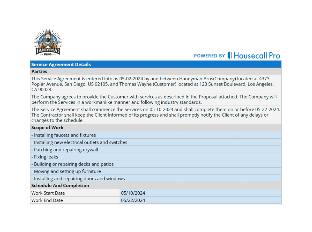 Handyman pros use service agreements to manage expectations and mitigate risk. In home services, conflict often stems from misaligned expectations rather than work quality. A standardized document ensures both parties remain on the same page.