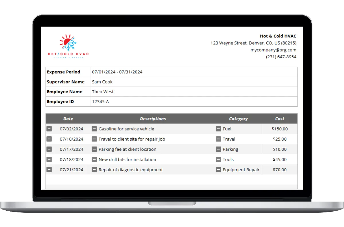 Creating accurate and thorough expense reimbursement report is essential for any HVAC company. Having a simple, straightforward HVAC expense reimbursement template makes it a whole lot easier. Our HVAC expense reimbursement template features: