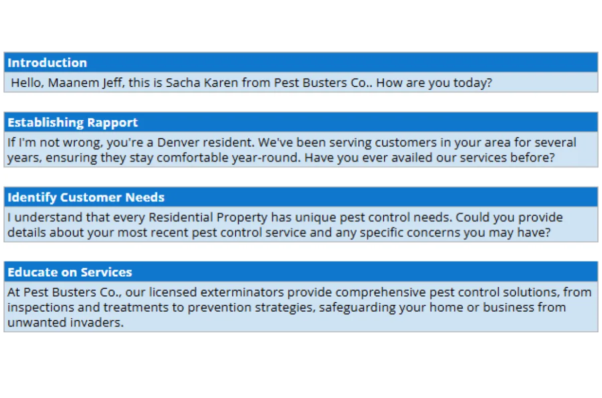 This pest control sales script template is a quick and easy way to make sales scripts, save time, and ensure operational efficiency.