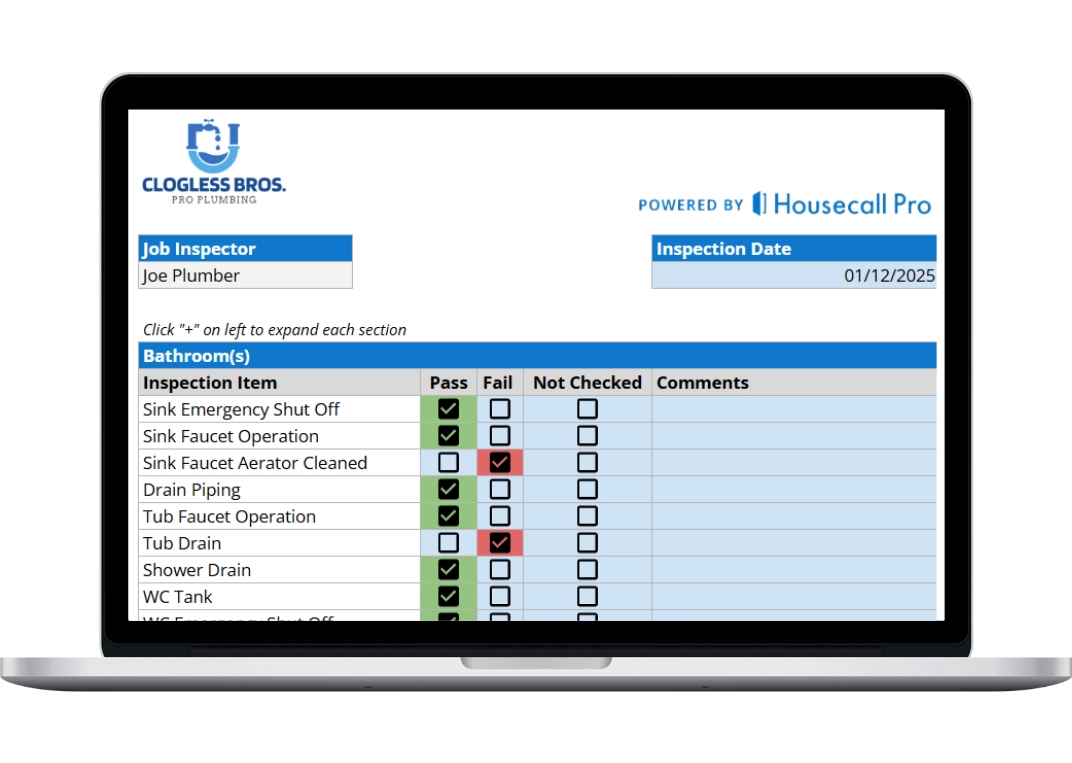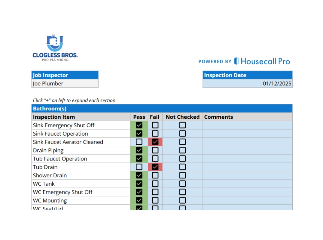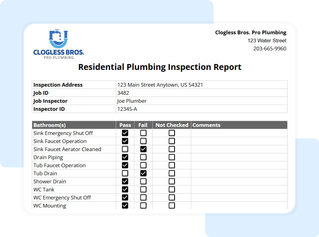 This free residential plumbing inspection checklist template gives your team a professional, printable form to document inspection results, recommend necessary repairs, and maintain detailed records.