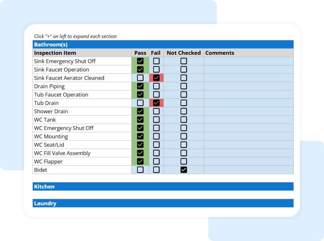 - Status Indicators (Pass/Fail/Not Checked): Each row features easy-to-use toggle fields. Technicians can mark an item as Pass, Fail, or Not Checked, allowing for a quick visual scan of the system’s health.
