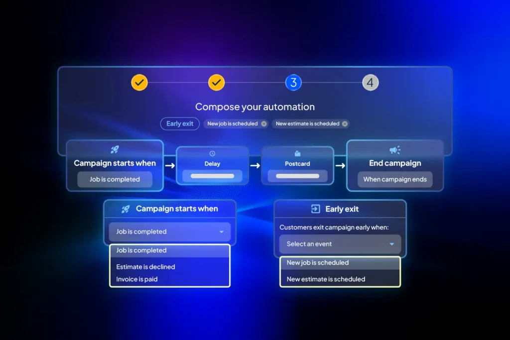 Exit logic: Automatically stop campaigns once a customer takes action. With new “stop when” conditions, messages end as soon as goals are met (like a job being scheduled or a review being submitted). No more over-messaging your customers.