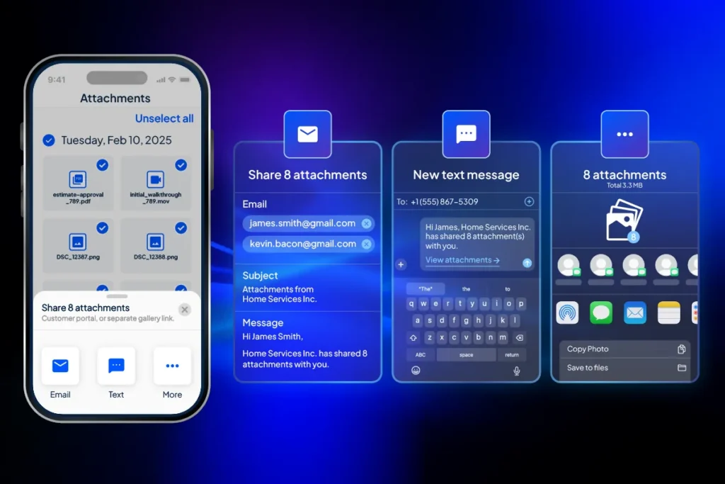 Previously available only on desktop, gallery sharing is now in the mobile app. Select multiple attachments from a customer profile and send them via SMS or email in just a few taps.