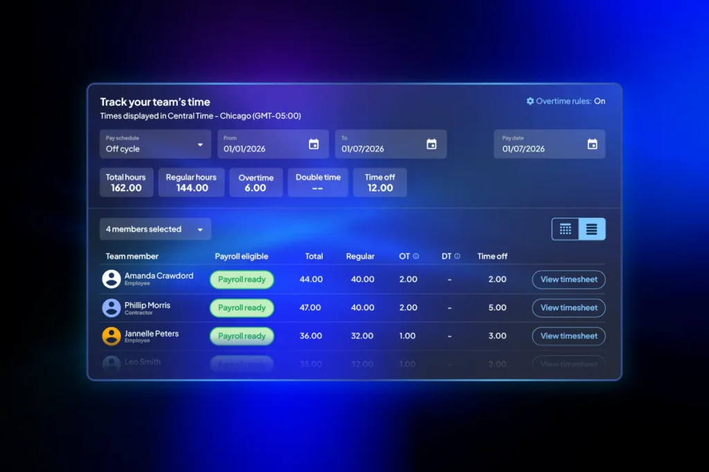 - Select which team members to include in payroll, and manage their timesheets in one place
