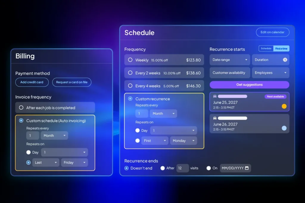Schedule appointments, save a card on file, and set up auto-invoicing for maintenance plans and service contracts. It’s a faster way to manage repeat visits while reducing admin time.